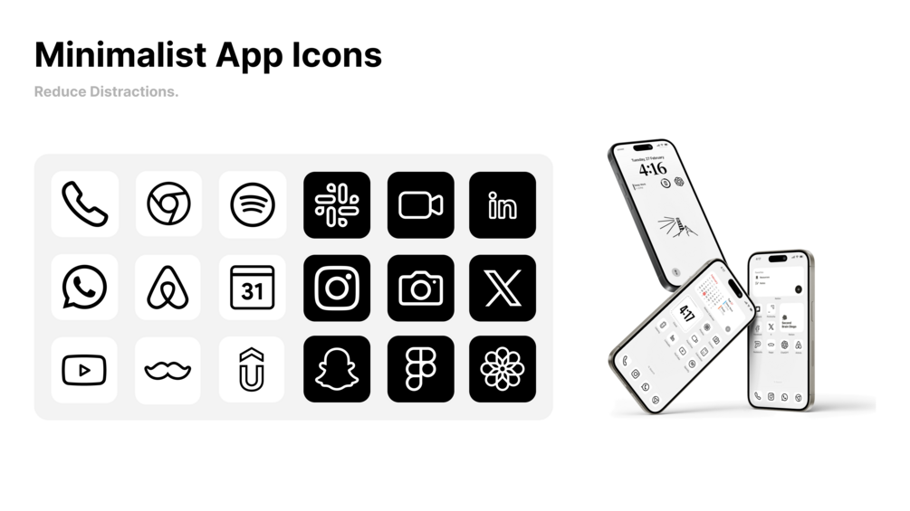 Reduce distractions in your day to day tool (Phone). Focus on what's important and elevate your device aesthetic with this Minimalist App Icons Pack.